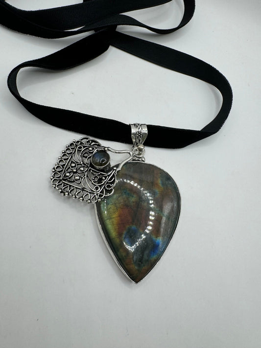 Vintage Silver Genuine Rainbow Labradorite Choker Black Velvet Necklace.