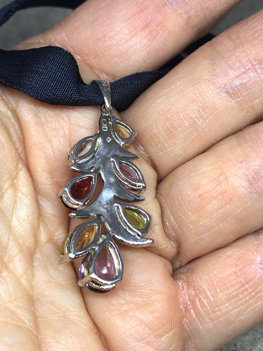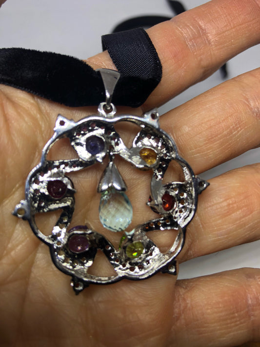 Vintage Handmade 925 Sterling Silver Genuine Mixed Colored Gemstone Antique Pendant Necklace