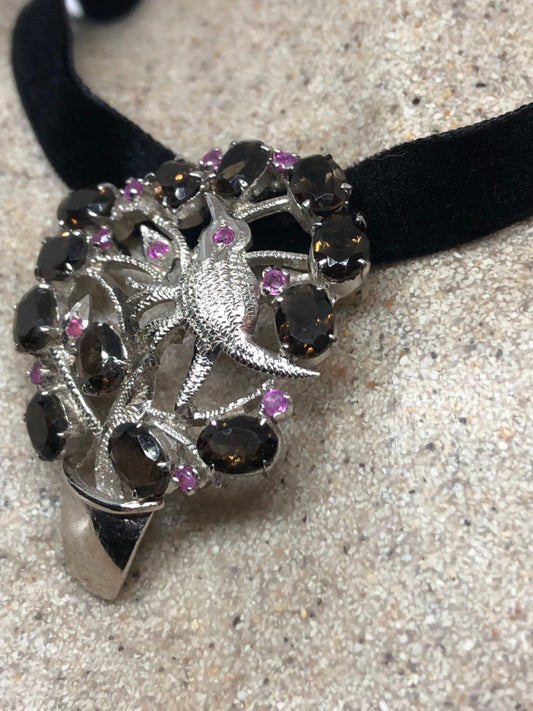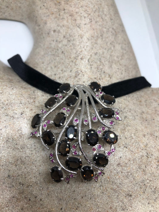 Vintage Handmade Smoky Topaz and Genuine Ruby 925 Sterling Silver Rhodium Brooch Necklace