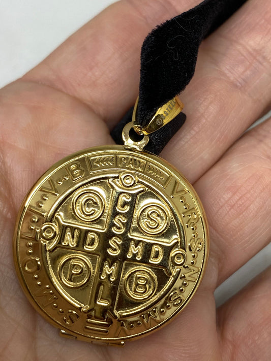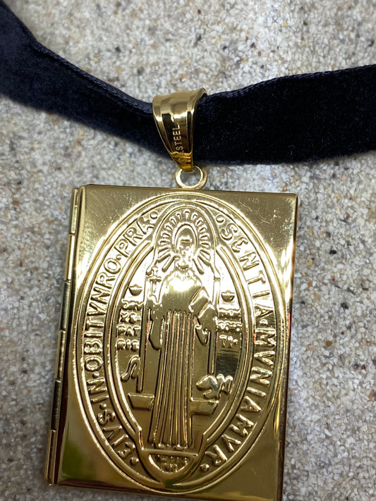 Vintage San Bernidito Locket Choker Golden Stainless Steel Deco Etched Necklace