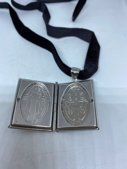 Vintage Cross Locket Choker Silver Stainless Steel Deco Etched Necklace