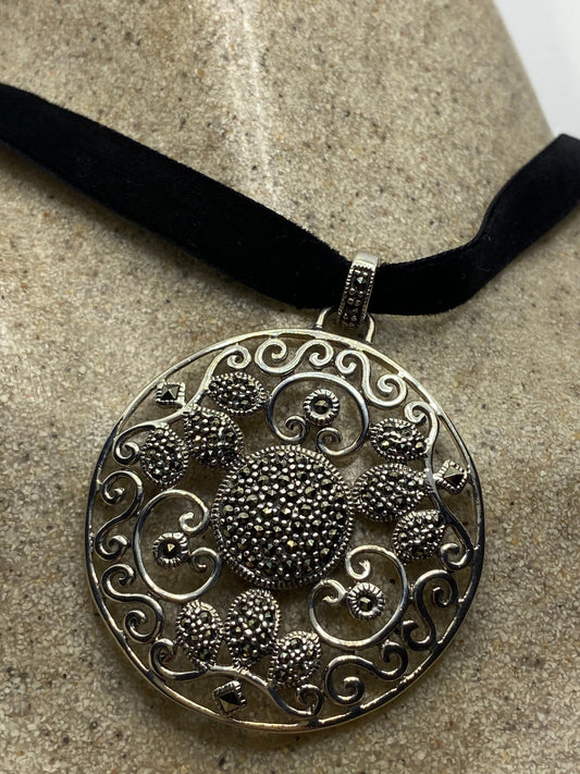 Vintage Marcasite 925 Sterling Silver Velvet Choker Pendant Necklace