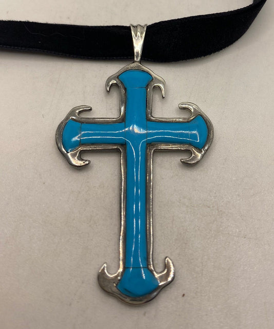 Vintage Turquoise Cross Choker 925 Sterling Silver Pendant Necklace