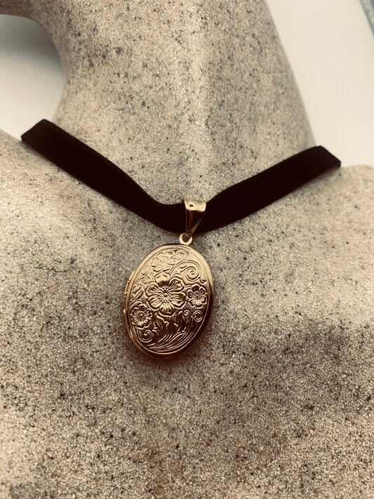 Vintage Flower Locket Choker Golden Stainless Steel Deco Etched Necklace