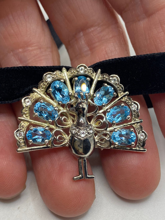 Vintage Blue Topaz Peacock Choker Pin 925 Sterling Silver Brooch