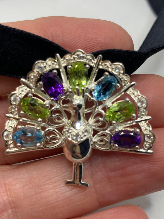 Vintage Mixed Gem Peacock Choker Pin 925 Sterling Silver Brooch