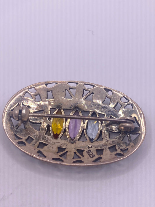 Vintage Mixed Gemstone Pin Marcasite 925 Sterling Silver Brooch