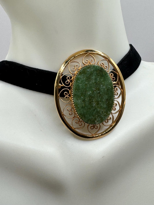 Vintage Green Jade Yellow Gold Filled Brooch Pin