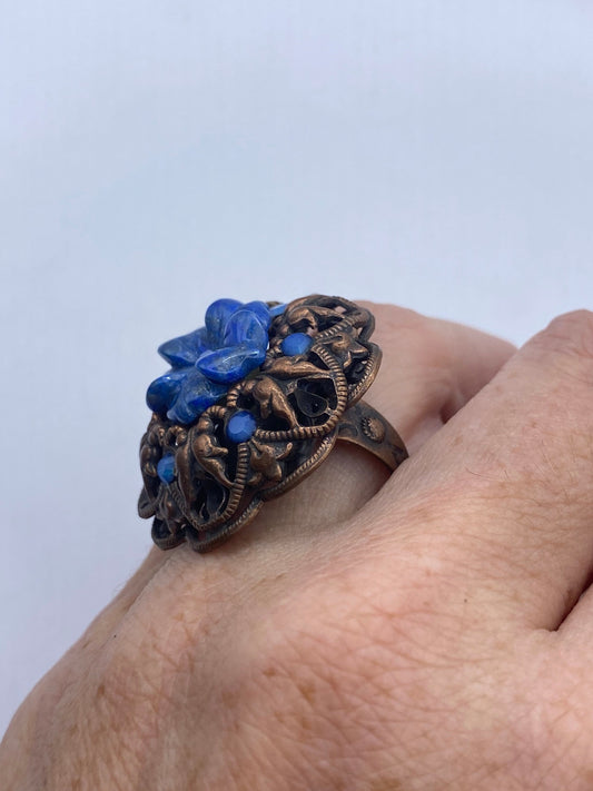 Vintage Lapis Lazuli Flower Stone copper Ring Adjustable
