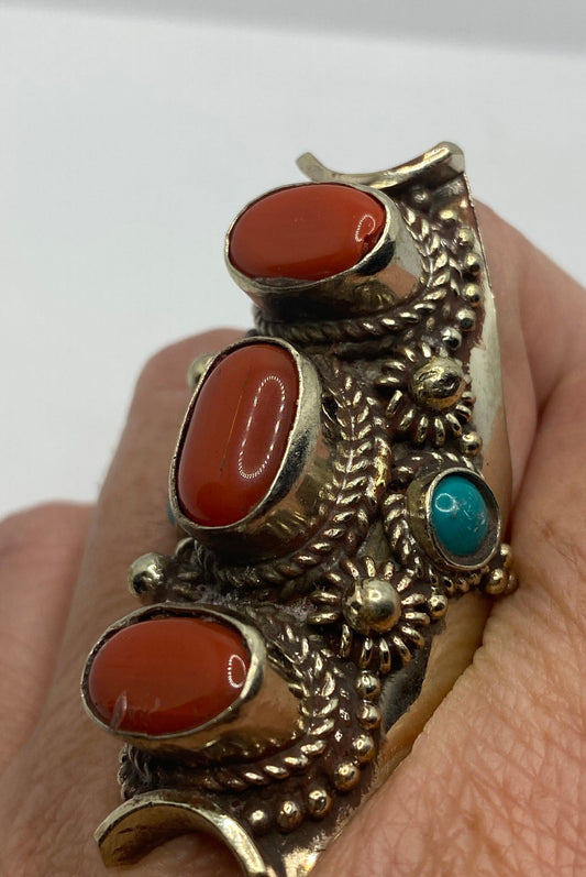 Vintage Red Turquoise Tribal Brass Antique Ring