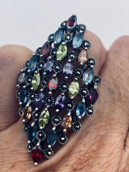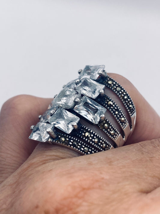 Vintage Genuine Swiss Marcasite Crystal Setting 925 Sterling Silver Cocktail Ring Size 7.5