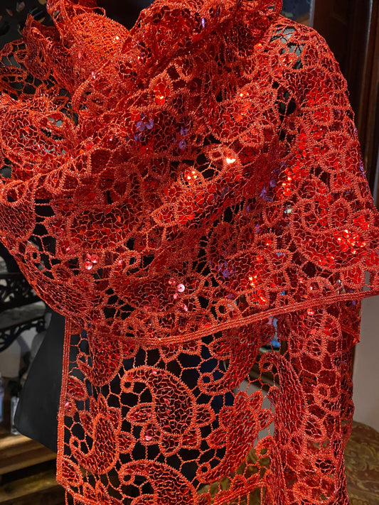 Vintage Style Shawl Wrap | Sheer Red Sequined Embroidered Light Coverup Festival Scarf