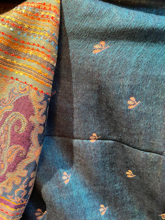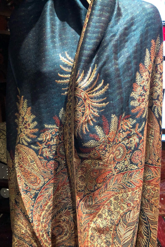 Jamawar Blue Gold Paisley Brocade Pashmina Scarf Wrap Shawl