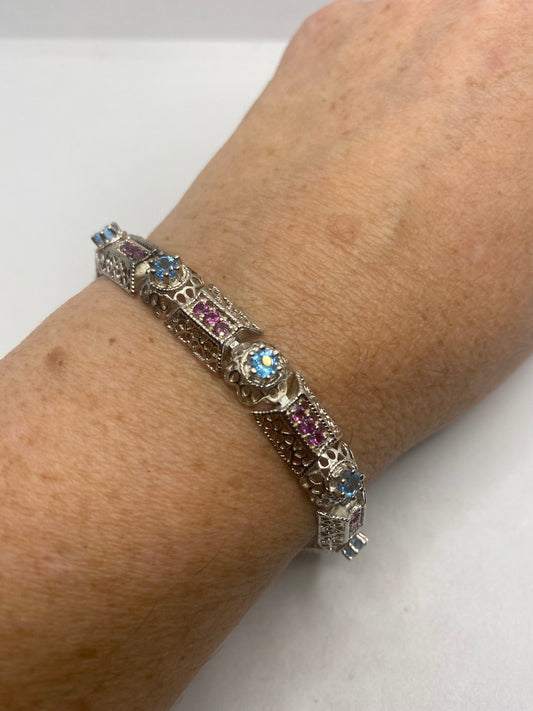 Handmade Genuine Blue Topaz and red Tourmaline Rhodium Finished 925 Sterling Silver Deco Bangle Bracelet