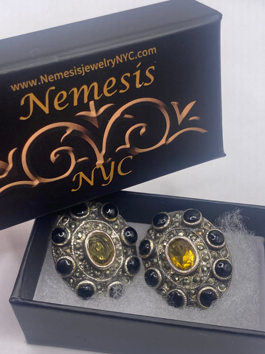 Vintage Marcasite Citrine Black Onyx 925 Sterling Silver Clip On Button Earrings