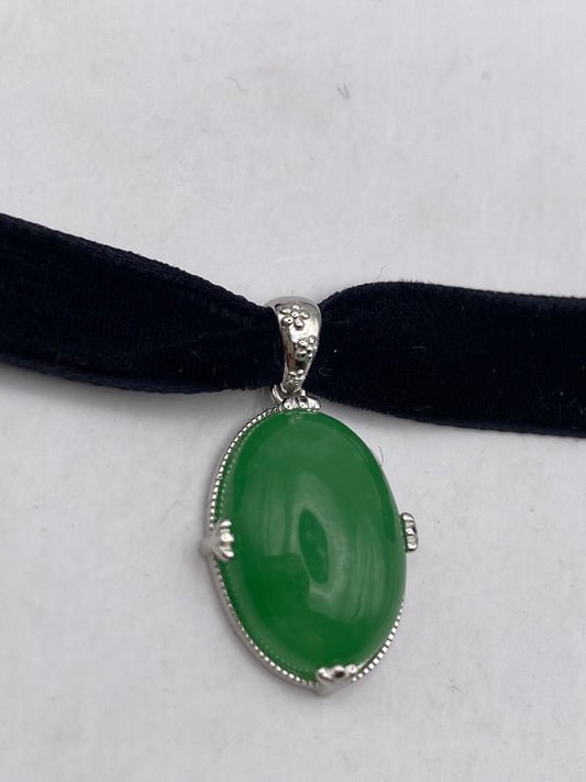 Vintage Green Jade Choker Silver Finish Necklace Pendant