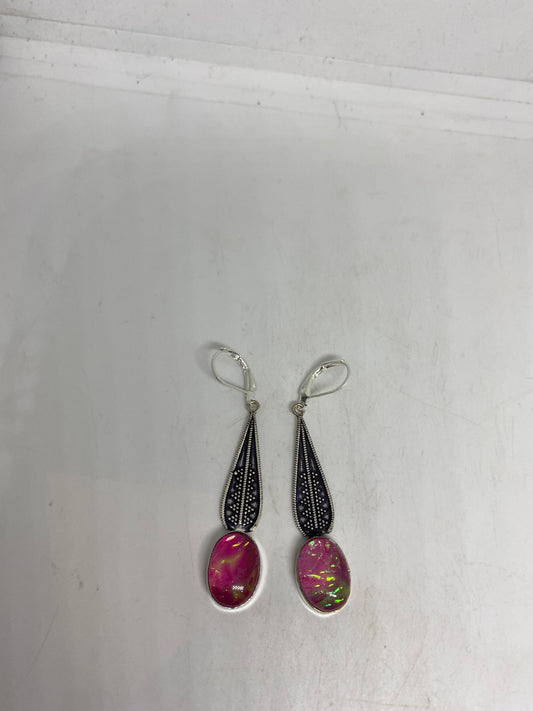 Antique Vintage Pink Butterfly wing Glass Silver Dangle Earrings