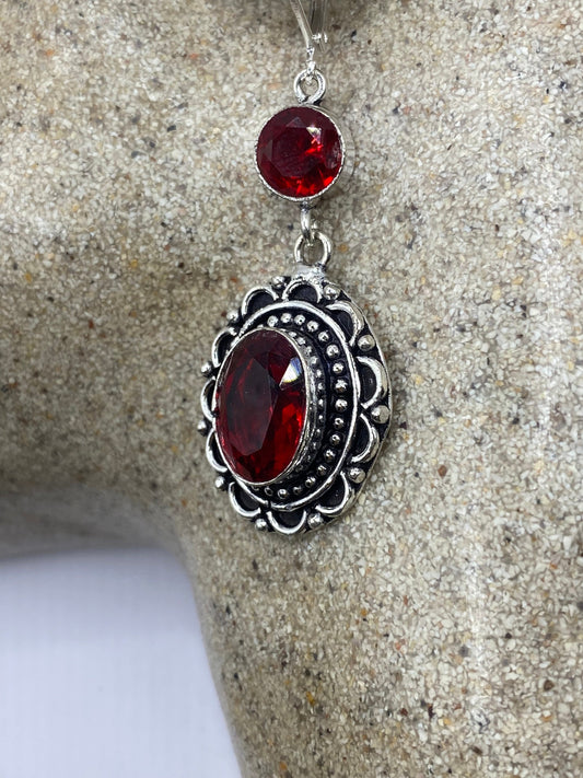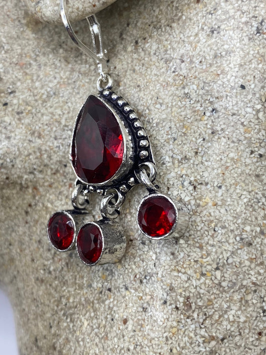 Antique Vintage Red Ruby Glass Silver Dangle Earrings