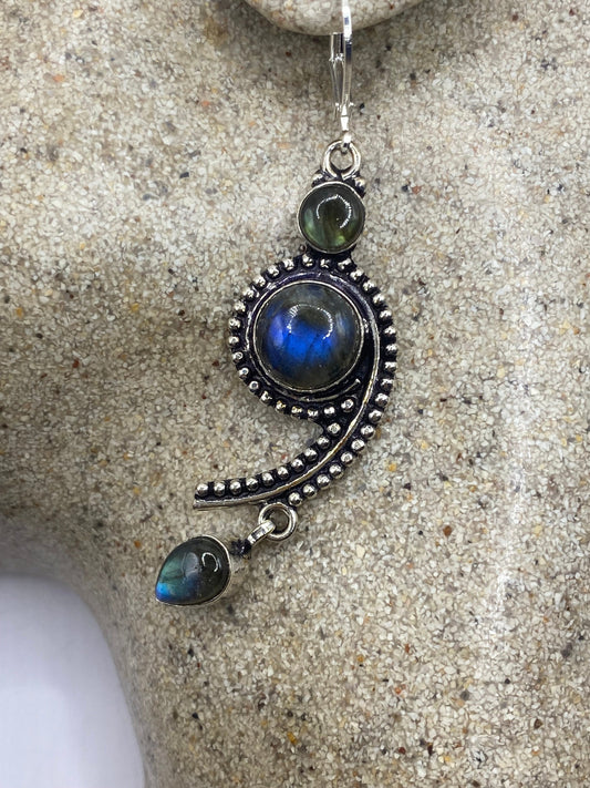 Antique Vintage Green Labradorite Silver Dangle Earrings
