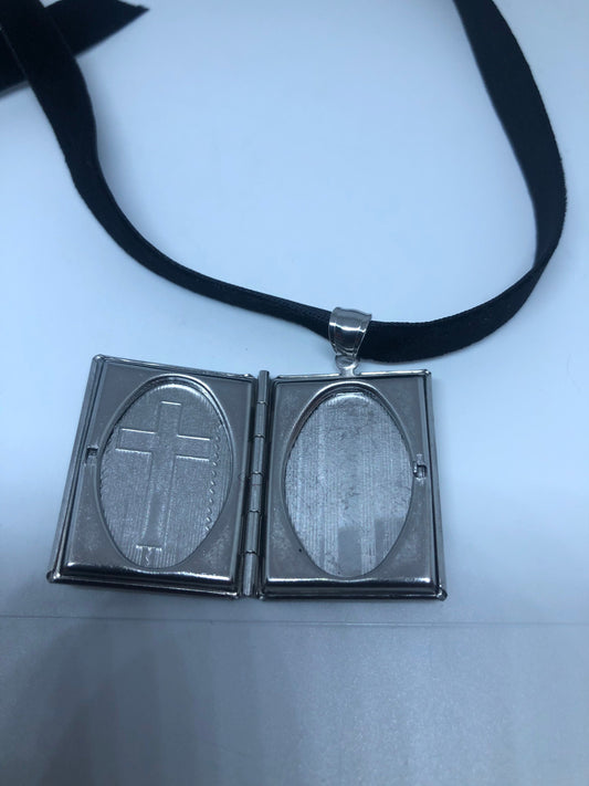 Vintage Cross Locket Choker Silver Stainless Steel Deco Etched Necklace