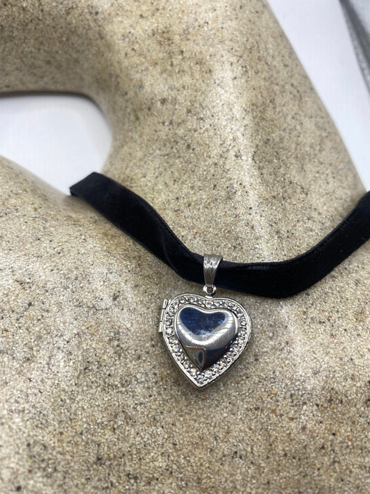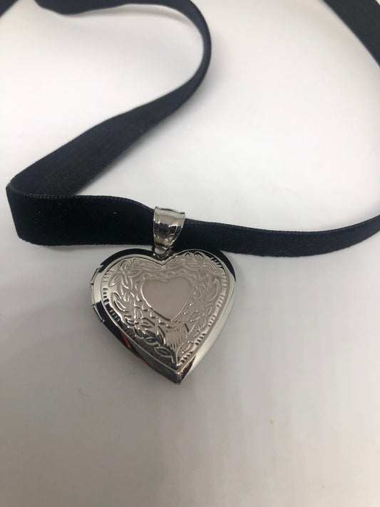 Vintage Silver Locket | Tiny Heart Photo Charm Stainless Steel Deco Etched Choker Necklace