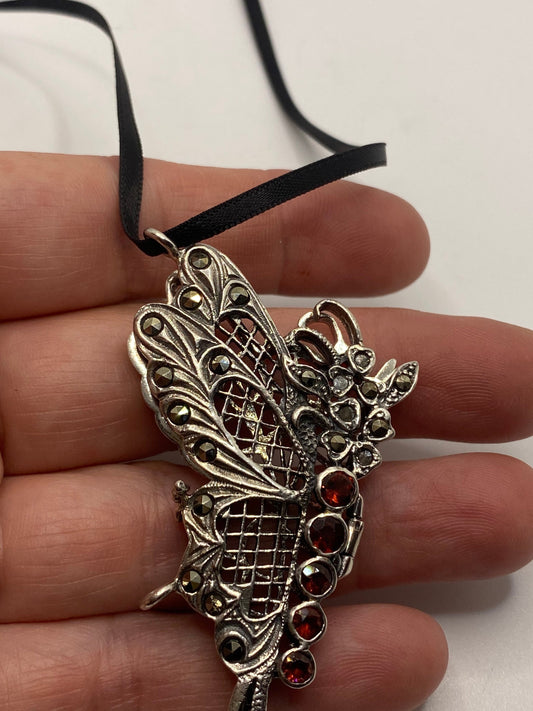 Vintage Marcasite Butterfly Locket 925 Sterling Silver Velvet Choker Pendant Necklace