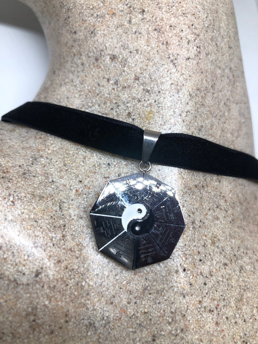 Vintage Yin Yang Gold Stainless Steel Gothic Pendant Necklace Velvet Ribbon Choker