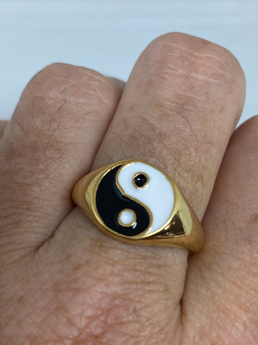Vintage Ying Yang Mens MArtial Arts Golden Stainless Steel Enamel Ring