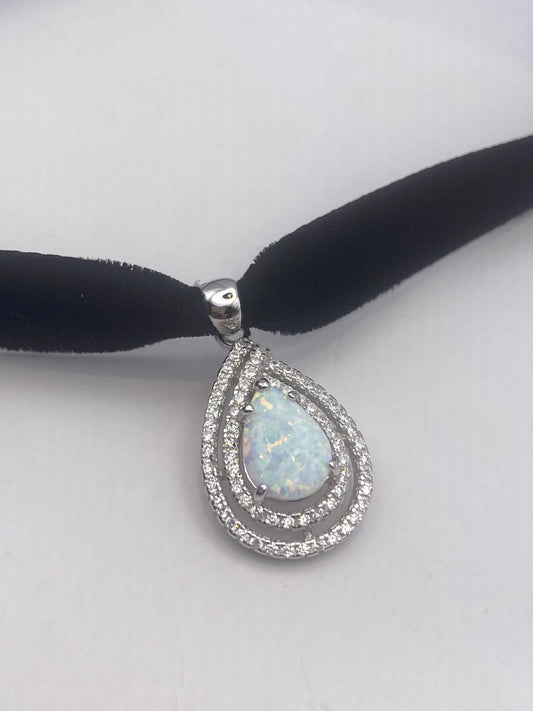 Vintage White Opal Choker 925 Sterling Silver Pendant Necklace