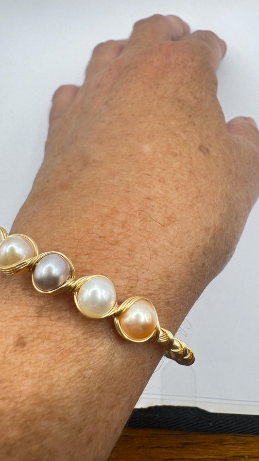 Vintage Pearl Cuff Bangle Bracelet Gold 925 Sterling Silver Hand Made