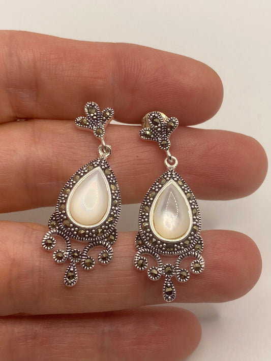 Vintage Genuine Marcasite Real Mother of Pearl 925 Sterling Silver dangle earrings