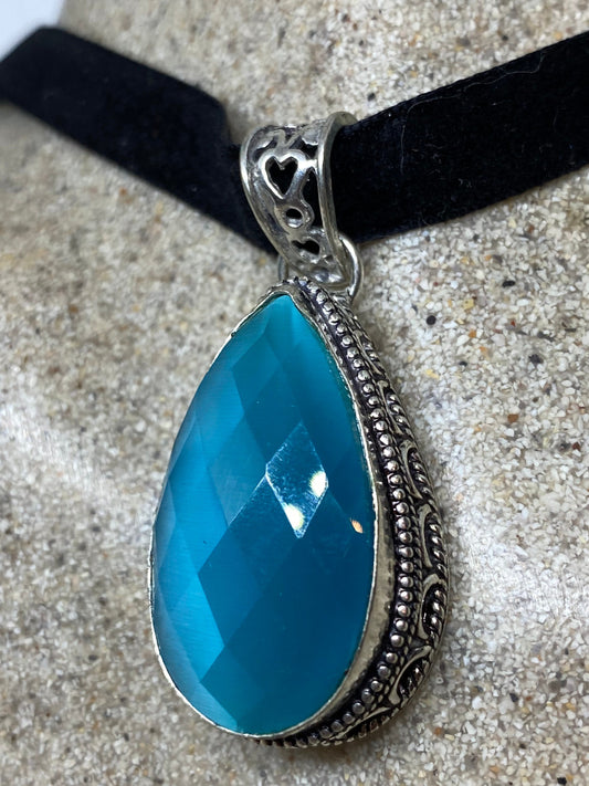 Vintage Turquoise Cats Eye Glass Antique Velvet Choker Necklace