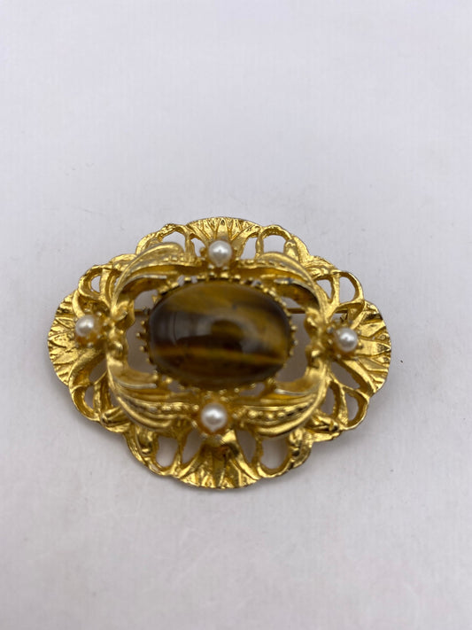 Vintage Tigers Eye Golden Brooch Pin