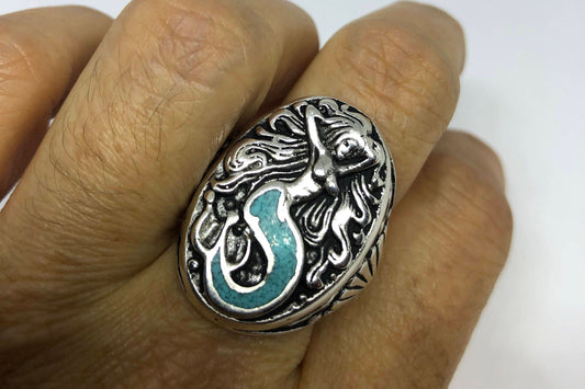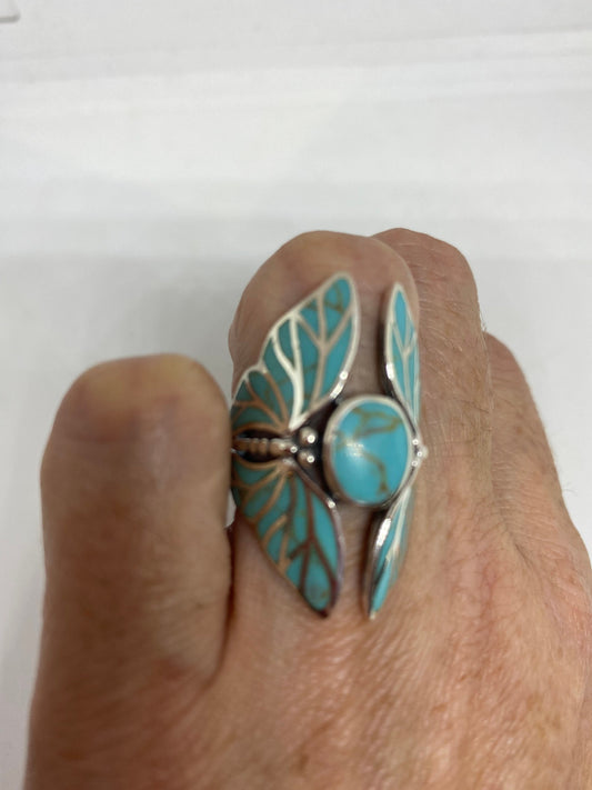 Antique Deco Turquoise Inlay Lunar Moth 925 Sterling Silver Ring