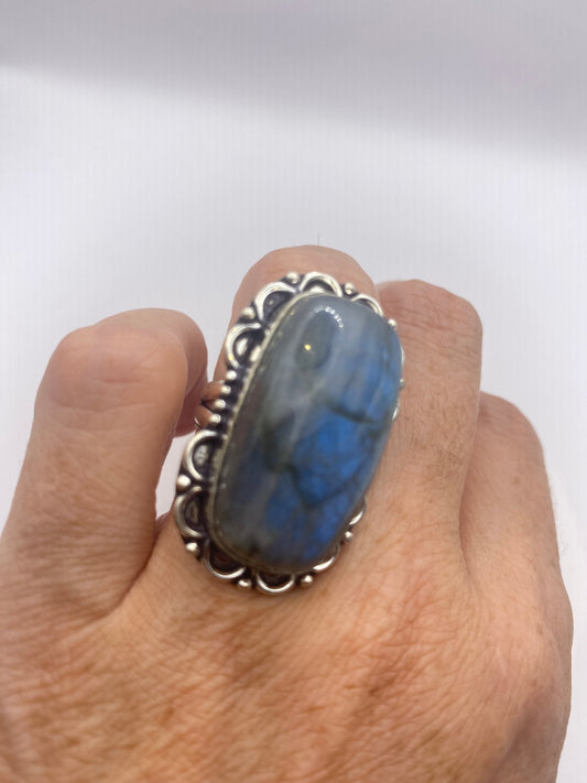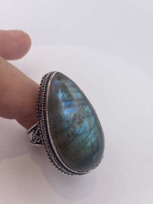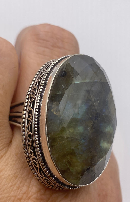 Vintage Blue Green Labradorite Moonstone Silver Cocktail Ring
