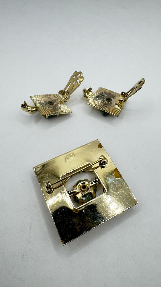 Vintage Green Jade Yellow Gold Filled Brooch Pin clip on earring set