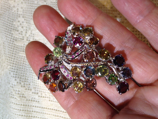 Vintage Handmade Genuine Mixed Tourmaline Gemstone 925 Sterling Silver Rhodium Brooch