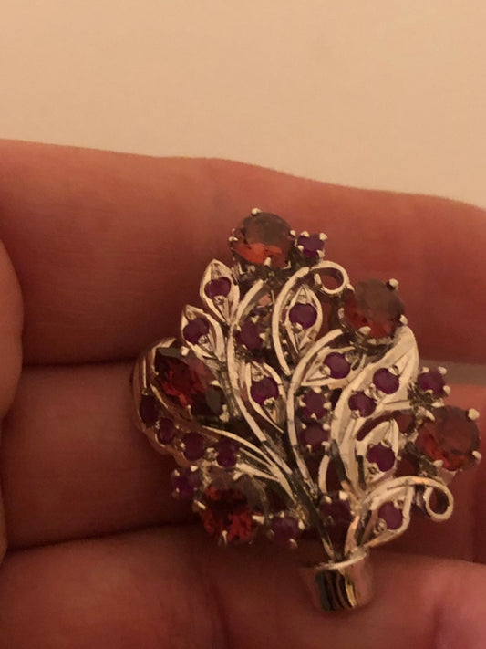 Vintage Handmade Genuine Rhodolite Garnet and Ruby 925 Sterling Silver Rhodium Brooch Pendant