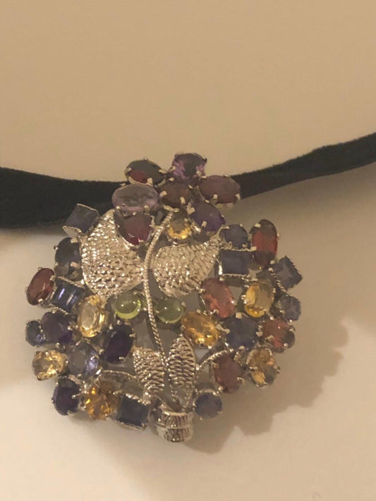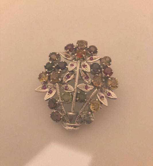 Vintage Handmade Genuine Mixed Gemstone 925 Sterling Silver Rhodium Brooch
