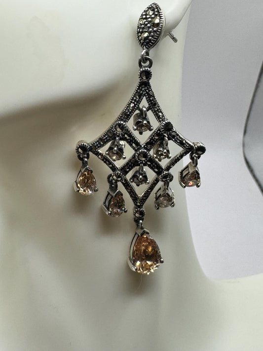 Vintage Champaign Cubic Zirconia Marcasite 925 Sterling Silver Dangle Chandelier Earrings